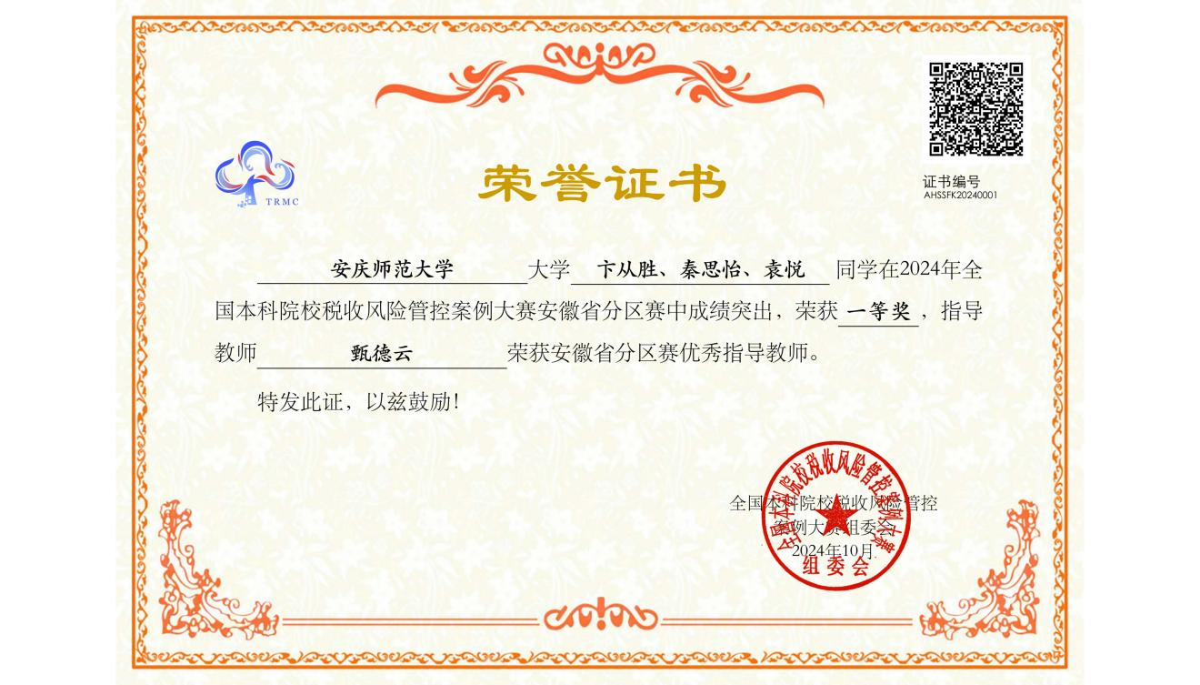 近日,2024年全国本科税收风险管控案例大赛安徽省分区赛获奖名单公布,由小说网 卞从胜、秦思怡、袁悦三名学生组成的“V我200”团队发挥出色,荣获省级一等奖,成功晋级全国总决赛,取得了小说网 在该项赛事的最好成绩。指导教师甄德云荣获安徽省分区赛优秀指导教师。