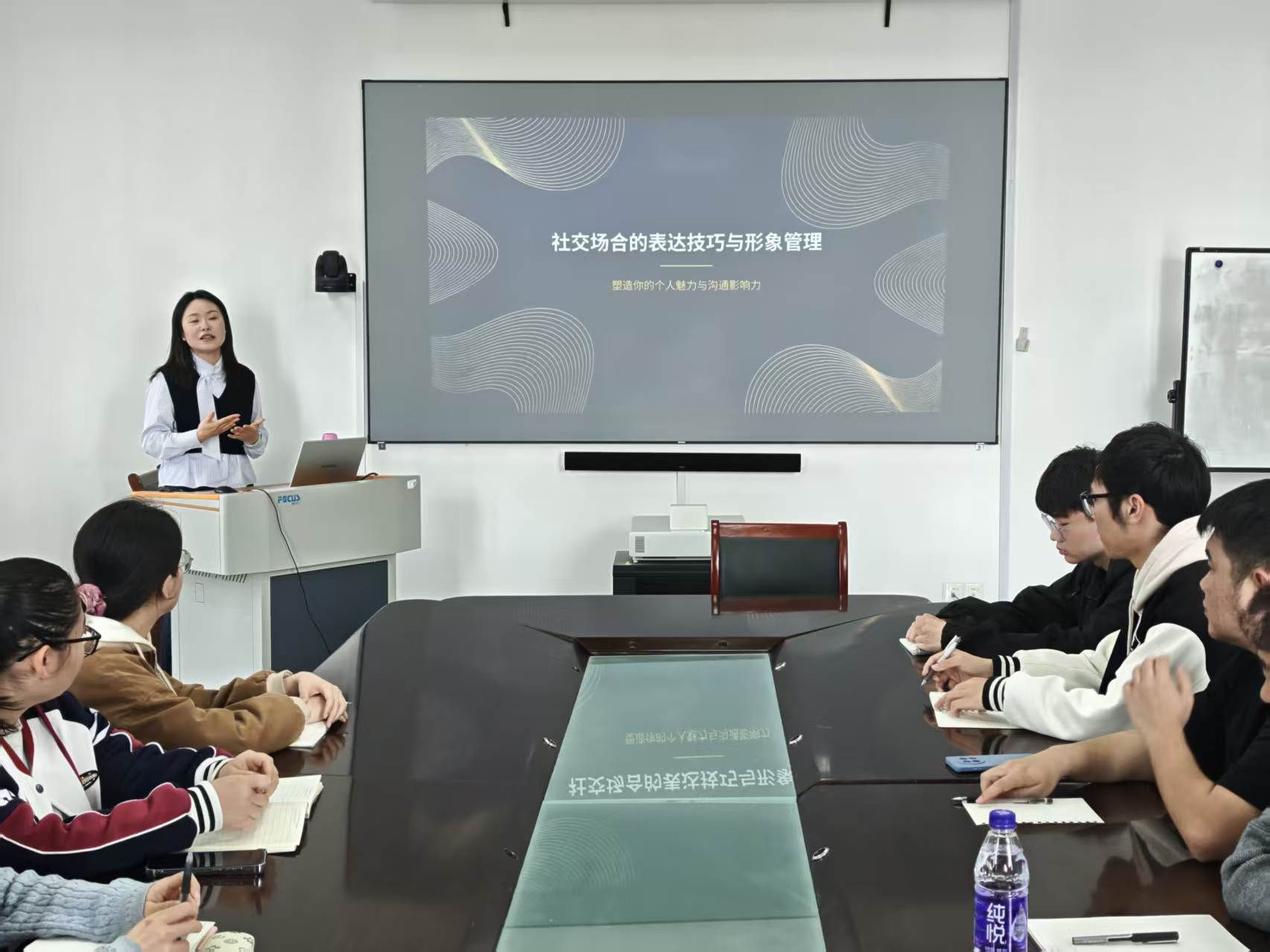 讲座中,陈漫雪围绕“形象管理”与“表达技巧”两大主题展开系统讲解。她结合不同社交与职场场景,从着装搭配、行为礼仪和语言表达等内容切入,介绍了服饰搭配与色彩运用技巧,并围绕眼神交流、倾听反馈和表达逻辑等内容,引导同学们塑造专业、得体、自信的个人形象,提升在社交场合中的亲和力、表现力和沟通能力。