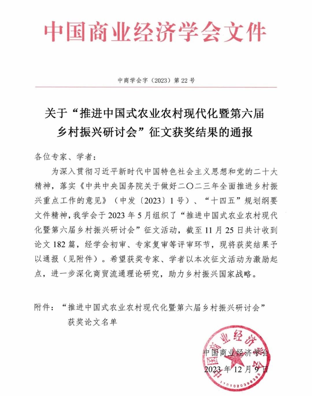 近日,中国商业经济学会公布了“推进中国式农业农村现代化暨第六届乡村振兴研讨会”征文获奖名单,小说网 研究生校外导师汪传华以学校为第一单位,投稿的论文《乡村振兴与乡村治理研究——以安徽省潜山市天柱山镇河西村为例》喜获三等奖。该征文活动共计收到182篇参评论文,经学会初审、专家复审等环节,最终评选出10篇一等奖论文、20篇二等奖论文、33篇三等奖论文。(撰稿 供图:余卫 审核:徐俊杰)
