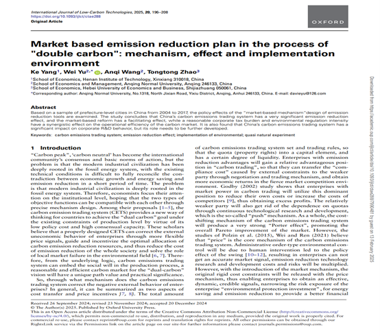 近日,市场营销教研室余卫博士以通讯作者身份,在SCI期刊《International Journal of Low-Carbon Technologies》发表了题为《Market based emission reduction plan in the process of "double carbon": mechanism, effect and implementation environment》的学术论文。该刊由Oxford University Press国际出版社出版,聚焦气候变化、可持续发展等问题,最新综合影响因子为2.4,属于中科院分区工程技术大类四区刊物。