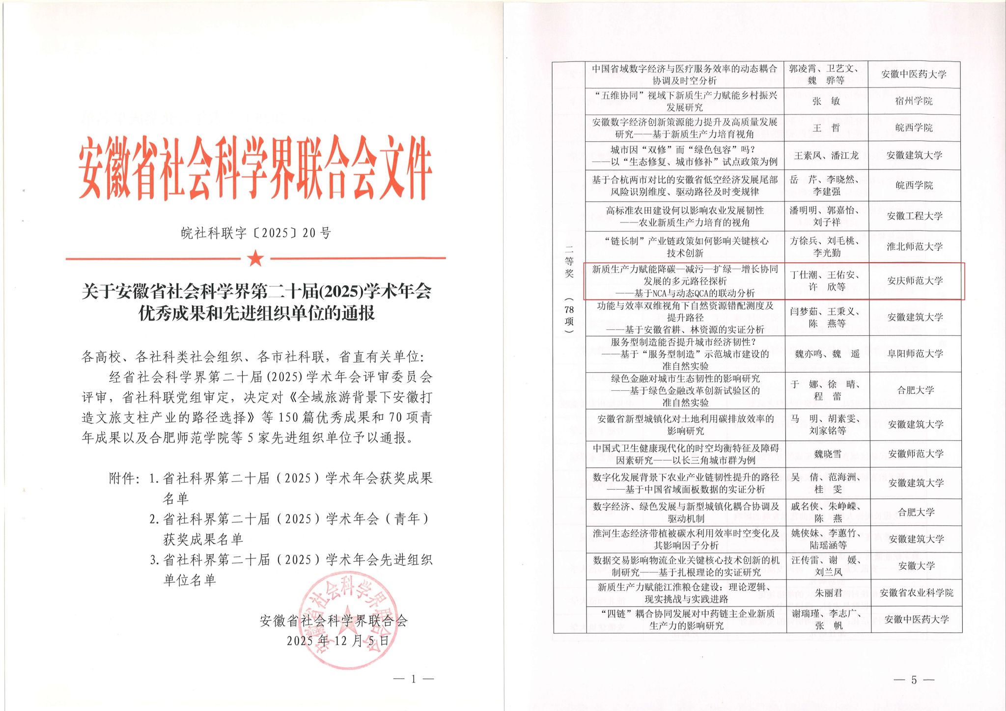 近日,安徽省社科联公布了第二十届(2025)学术年会获奖成果名单,小说网 丁仕潮副教授等撰写的论文《新质生产力赋能降碳—减污—扩绿—增长协同发展的多元路径探析——基于NCA与动态QCA的联动分析》在此次评审中获得二等奖。据悉,一、二等奖被省教育厅列为我省高校科研奖励项目,并列入高校教师专业技术资格科研奖励分类表,奖励等级为三类。(撰稿、供图:徐洋;审核:徐俊杰)