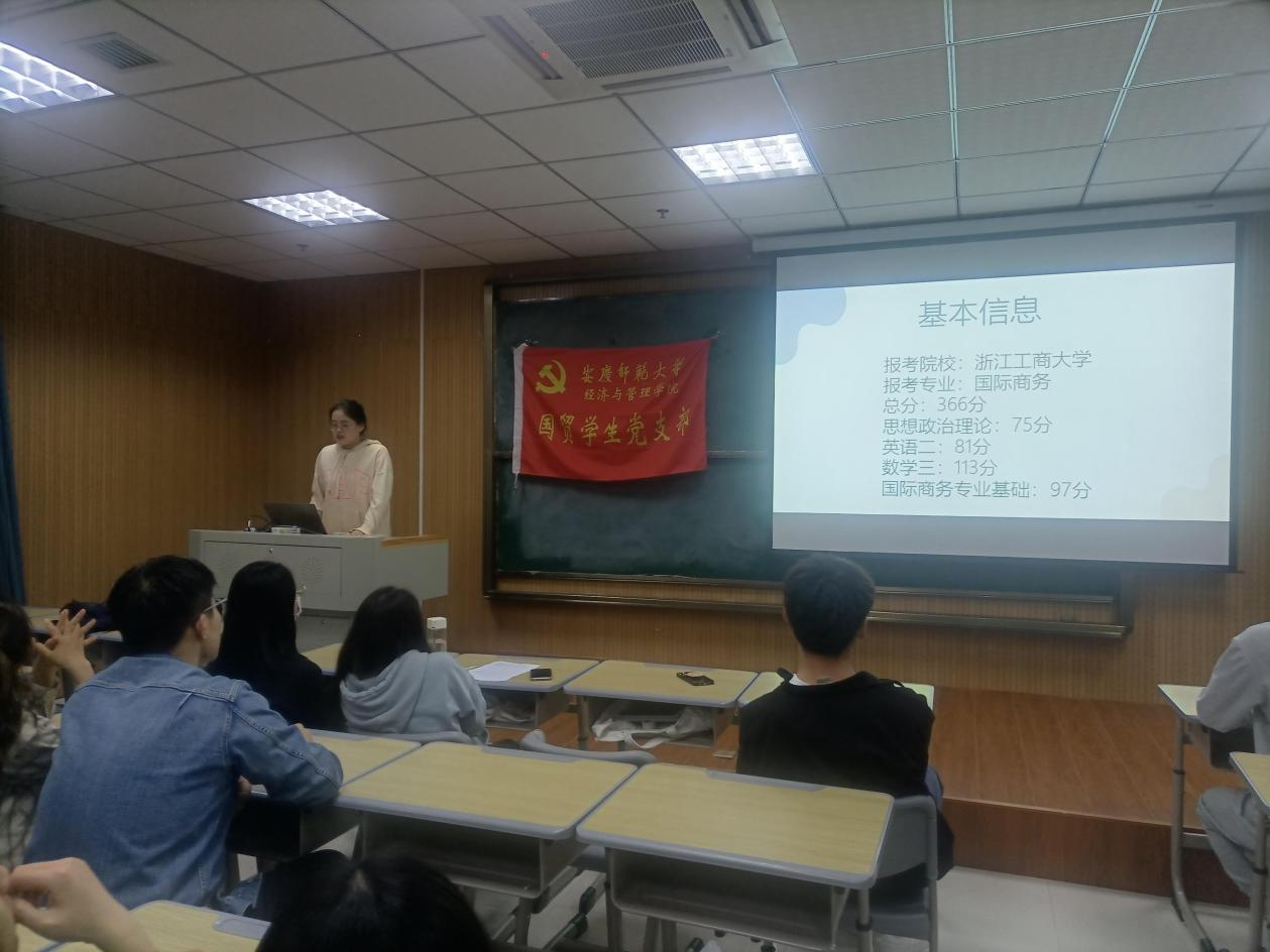 交流会上,三位支部党员向同学们介绍了国贸专业考研的方向,既可以如吴静、戴安琦一样,坚持在本专业继续深入研究学习,亦有如康文一般挑战自己,从经济类跨考数学并顺利“上岸”。在选好方向的基础上,他们鼓励同学们积极利用网络平台获取有益信息,合理选择考研院校,才能实现事半功倍。他们结合自身考研经历,从阶段性安排、前期准备、心态调整等方面给出了很多实用建议。