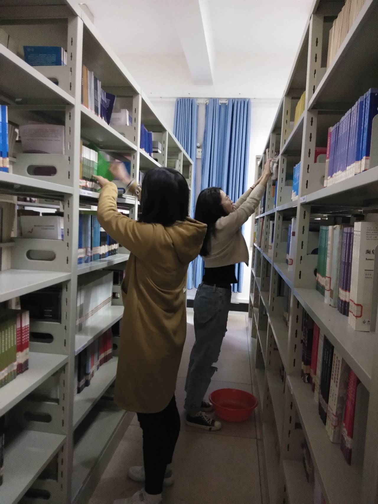 每个人佩戴好党徽,在约定的集合时间,分为三个小组,分别前往三个阅览室进行书籍整理、擦拭书架、拖地擦窗等志愿服务工作。预备党员田晨曦活动发表感言,她说“正如习近平总书记所言,志愿服务是社会文明进步的重要标志,作为当代大学生我们应该多多开展此类志愿服务活动,将志愿服务融入我们的日常生活。