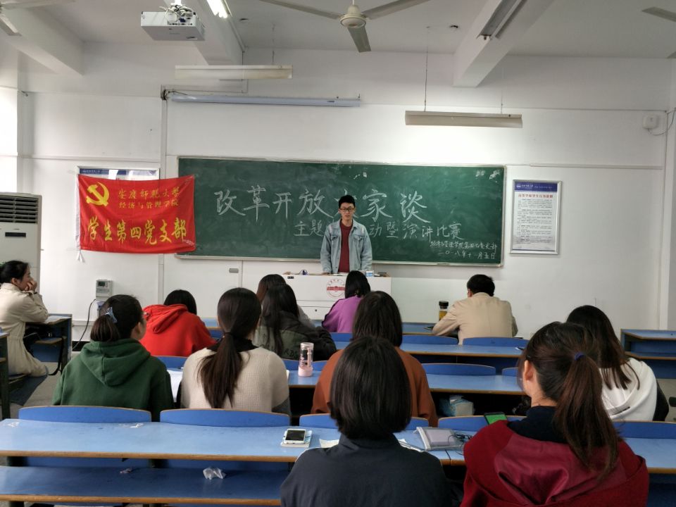 学生第四党支部、学生第七党支部在C505教室开展“改革开放大家谈”主题党日活动暨演讲比赛。学生第四党支部书记徐菲、学生第七党支部书记孙栎简、学生第八党支部书记贺卫,学生第四党支部、第七党支部全体党员参加此次活动。