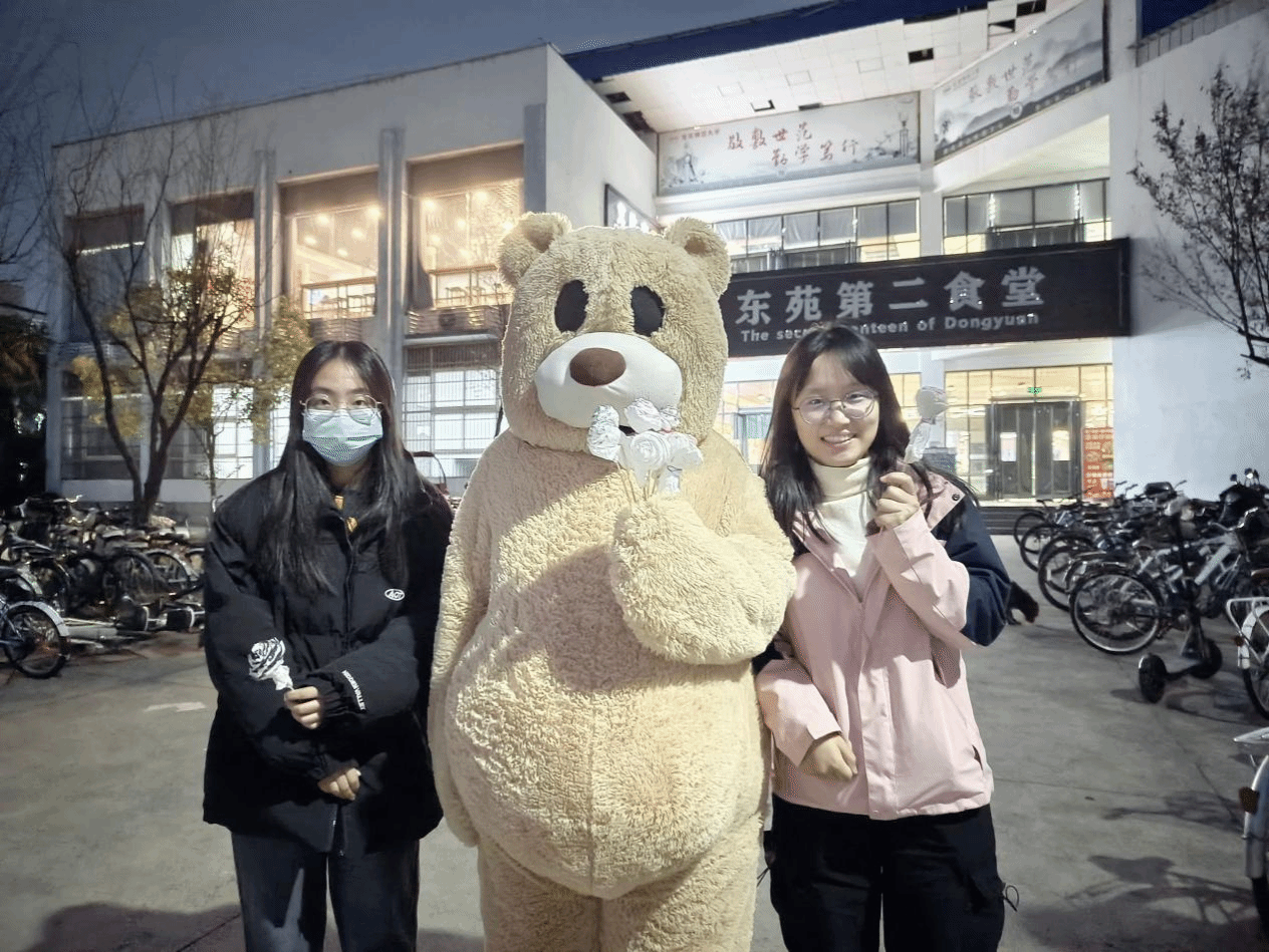 同学们将一张张平平无奇的纸巾制作成一束束五颜六色的花朵,这些礼物由“小熊玩偶”递到校园里的同学手中。“我送给了在操场散步的同学,希望一枝寓意祝福的花朵能消散他们内心的阴霾。”市场营销专业2022级的张文翔一开始制作花朵时并不熟练,在一次次与同学的交流学习中,他终于将自己完成的第一件礼物赠予同学。