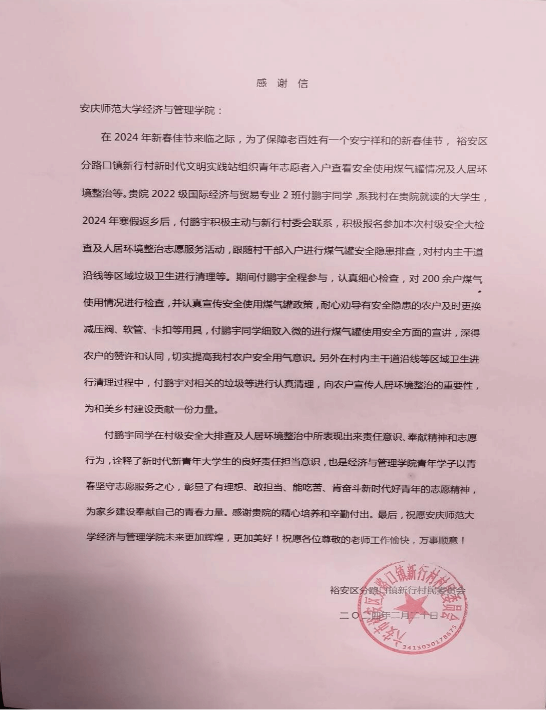 2022级国际经济与贸易2班的付鹏宇同学在寒假期间,积极响应家乡村委会组织号召,参加村级安全大检查及人居环境整治志愿服务活动表示感谢。