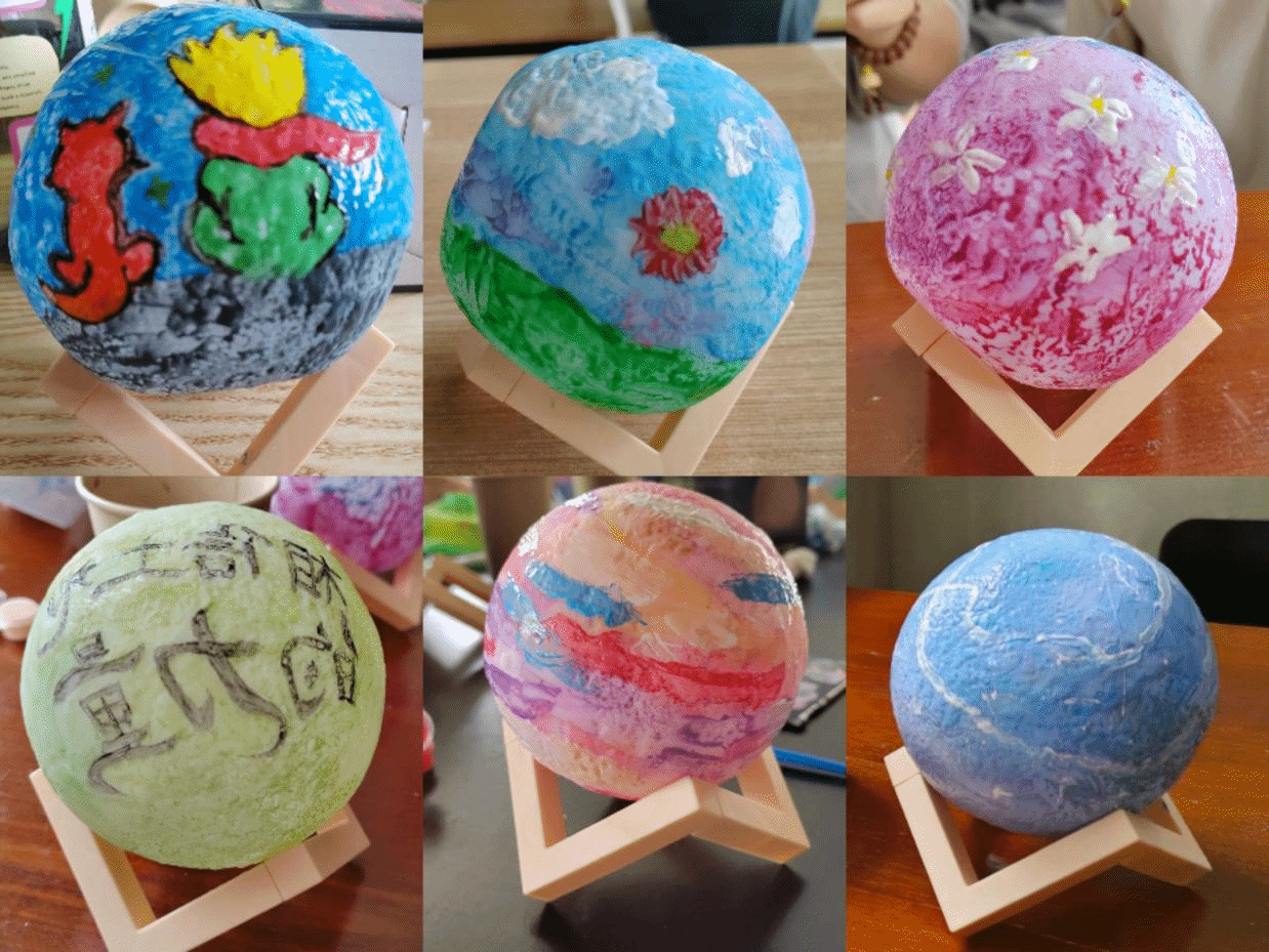 在活动现场,同学们手握画笔,脚踏斑斓颜料,描绘自己心中理想的地球。有的同学迅速勾勒出地球的轮廓,有的则细致入微地修饰细节。短暂的时间内,一颗颗璀璨闪耀的地球灯便跃然呈现在众人眼前。手绘完成后,同学们小心翼翼地为地球灯安装底座,并接通电源。当地球灯绽放出耀眼的光芒时,同学们为地球母亲送上了最诚挚的祝福。