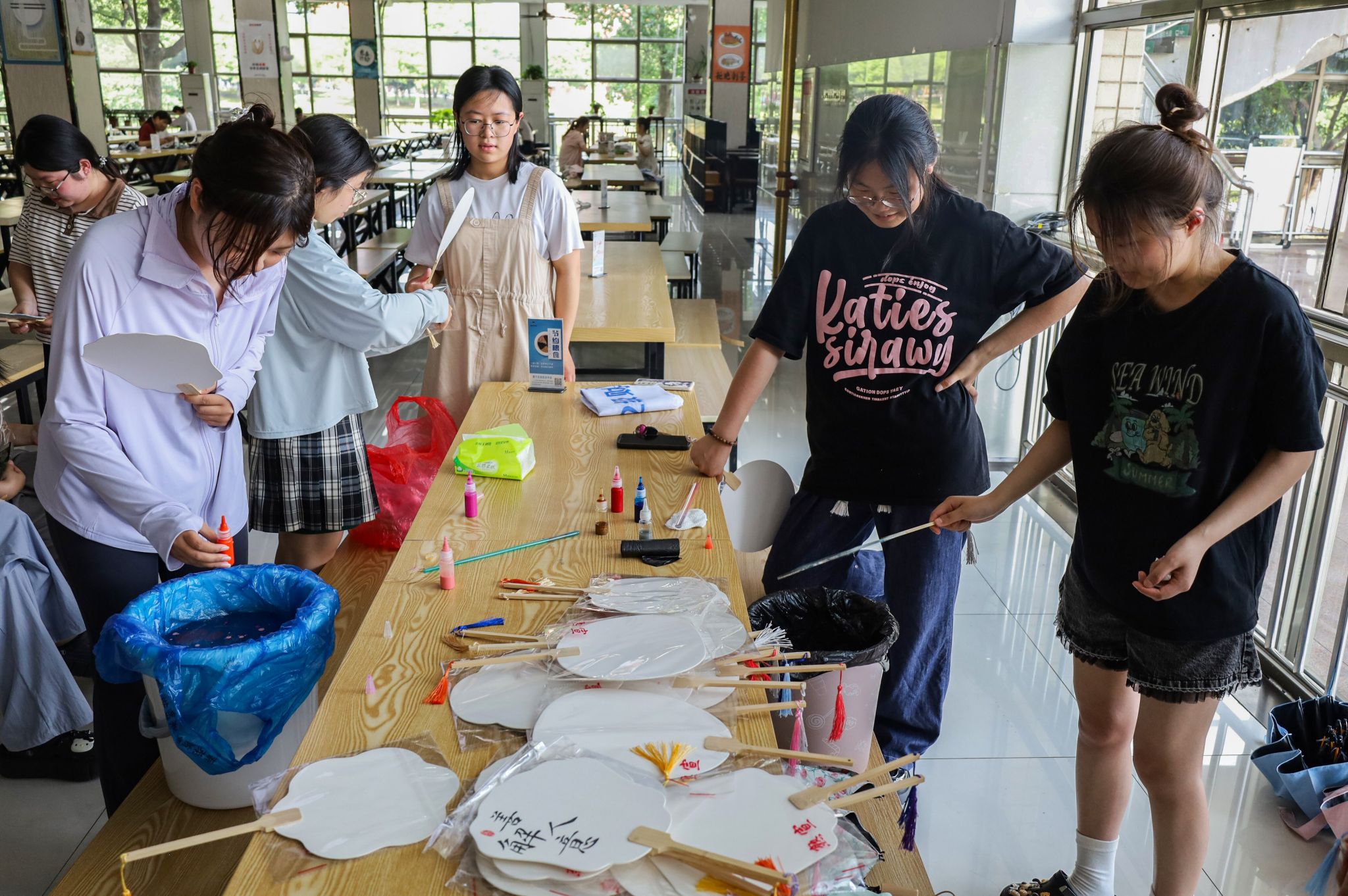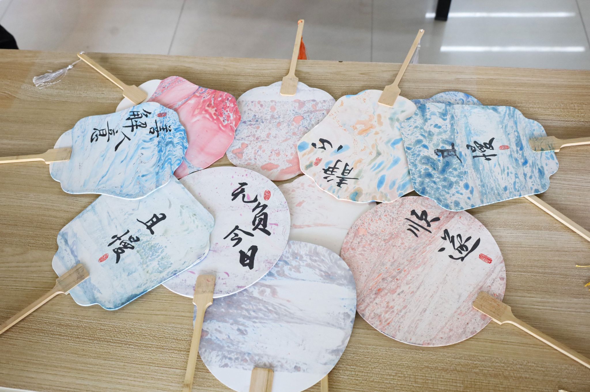 财务管理专业2022(1)班、2022(3)班全体学生在西苑食堂二楼共同举办了主题团日活动——非遗漂漆扇体验,他们以漆为笔,以水作画,在扇面上绘制创意画作。