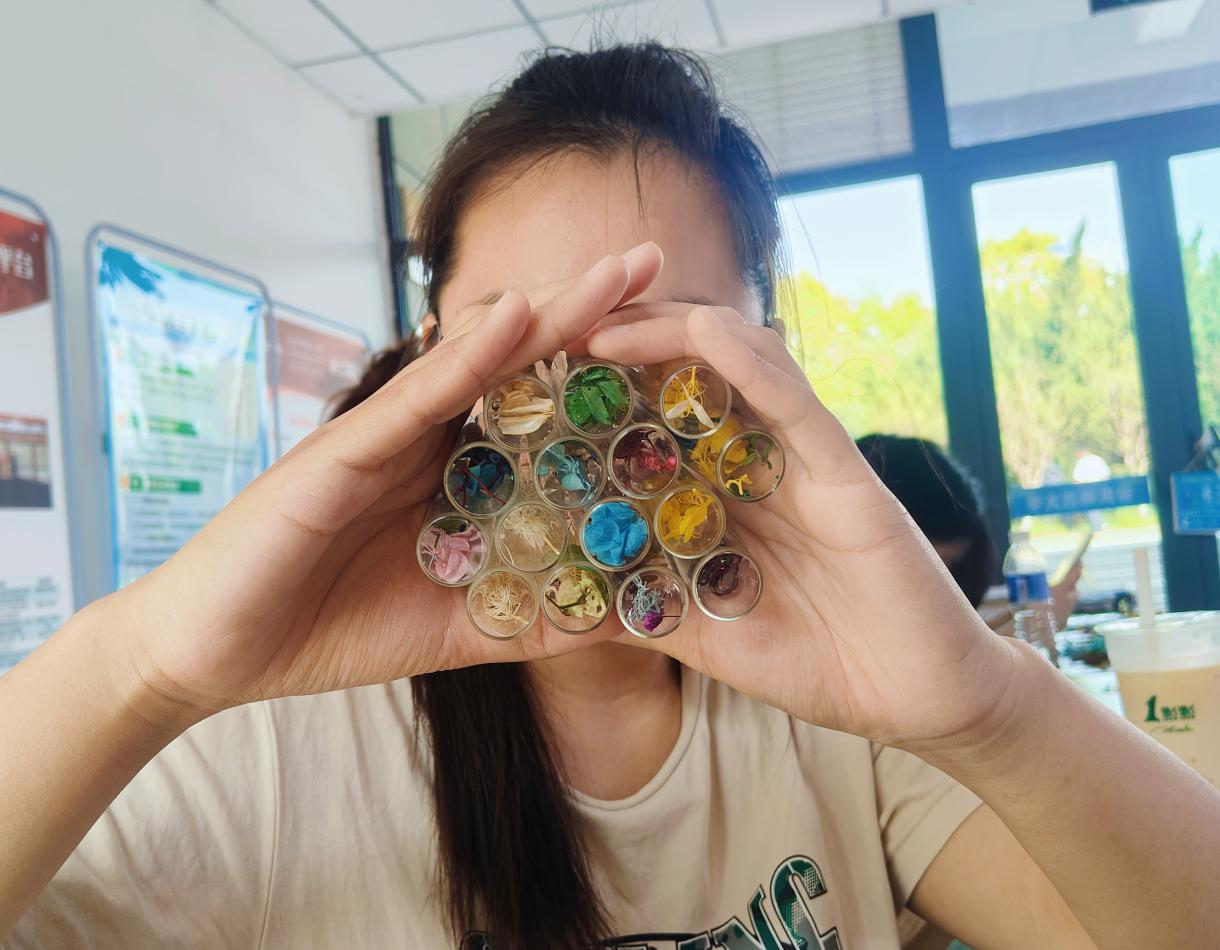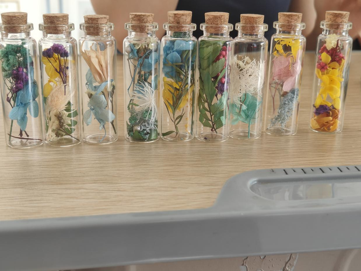 手执玻璃细挑选、编织干花释压力、分享心事互倾听……工作人员引导学生使用干花在玻璃瓶里进行创作,同学们充分展示自己的创作,表达内心想法。工商管理类专业2024级(2)班的郭笑彤同学表示:“在挑选自己心仪的干花和思考如何创作中,让我在释放情绪压力的同时体验到了感受到了创作的魅力。”财务管理专业2023级(1)班的李嘉怡同学在完成创作后兴奋地说道:“通过这次活动,我不仅缓解了压力,还结识了一群志同道合的朋友。”