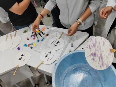在活动开始前,活动负责人认真采购材料,筹备活动相关物品。活动现场,同学们对此次活动兴致盎然,有序进行漆扇的绘制。大家先在桶中滴入各色的颜料,再用棍子搅拌成自己满意的形状,最后缓缓放入扇子,沾满颜料再捞起,这样,一把漂亮的漆扇就制作完成了。同学们在制作的过程中互相帮助,负责人也细心的指导他们,及时的答疑解惑,收拾残余的颜料,维护现场的秩序,整场活动井然有序,气氛活跃。