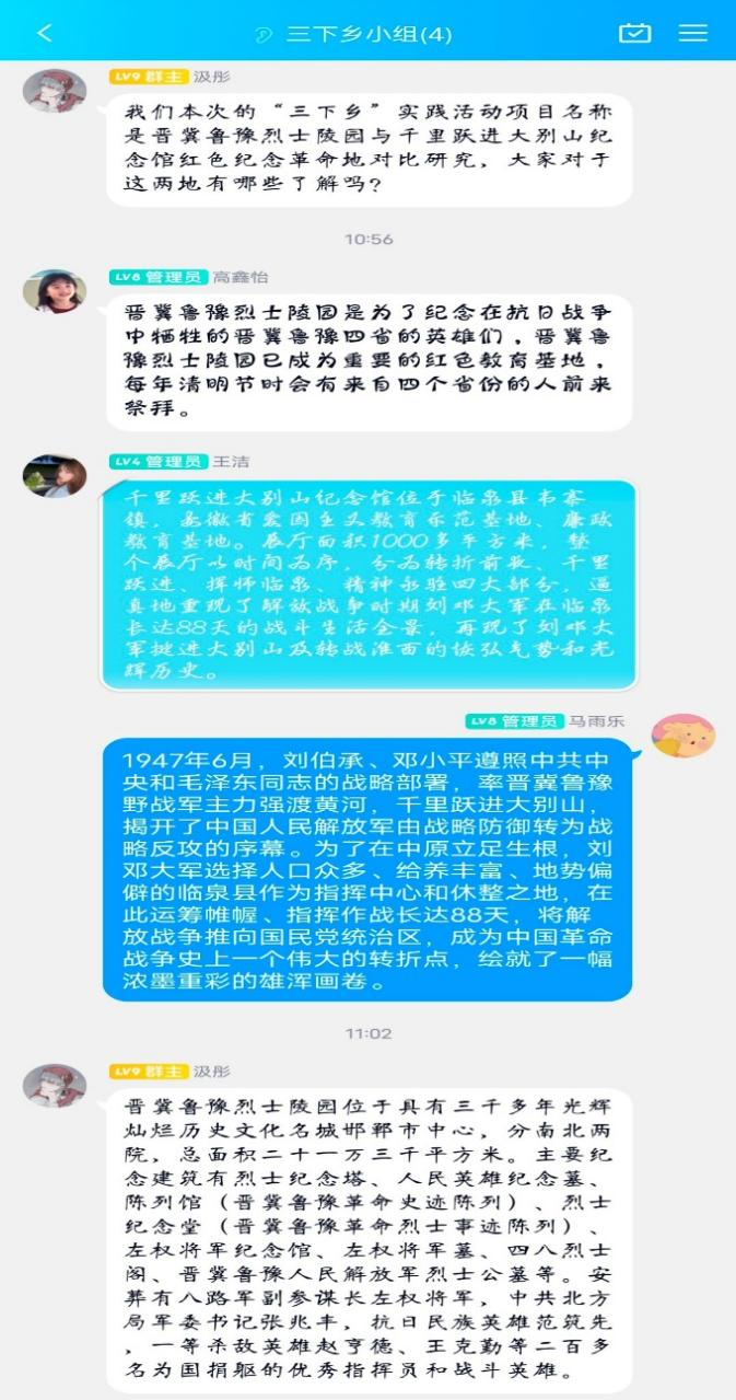 6月28日,由于疫情原因,全体成员在线上统一集合,由队长介绍活动任务及流程。大家一起分享搜查到的“晋冀鲁豫烈士陵园”和“千里跃进大别山纪念馆”的资料,了解到了晋冀鲁豫烈士陵园安葬有八路军副参谋长左权将军、中共北方局军委书记张兆丰等优秀指挥员,还有200多名为国捐躯的战斗英雄。千里跃进大别山纪念馆真实重现了解放战争时期刘邓大军在临泉长达88天的战斗生活全景,再现了刘邓大军挺进大别山及转战淮西的恢弘气势和光辉历史。团队成员分享的资料为实践活动的顺利开展奠定了基础。