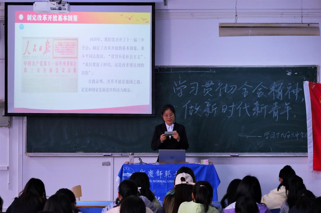 “一个主题”“两个确立”“三大历史性飞跃”“四个伟大成就”“党的百年奋斗的五个历史性意义”,宣讲团成员用数字“1、2、3、4、5”将主题串联,进行了深入浅出的的讲解。从实现中华民族的伟大复兴到党团结带领中国人民踏上实现第二个百年奋斗目标新的赶考之路,宣讲团成员用一件件鲜活的事例将十九届六中全会精神娓娓道来,赢得了同学们的的一致好评。