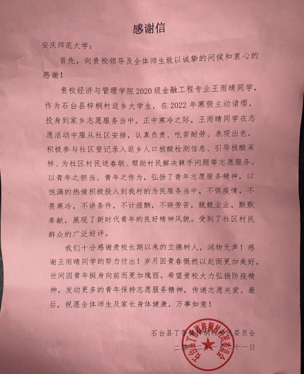 收到一封来自池州市石台县丁香镇梓桐村村民委员会的感谢信。信中介绍了2020级金融工程专业王雨晴同学主动与抗疫志愿服务的先进事迹,并对我校培养出“不惧疫情、不讲条件、不计报酬、不辞劳苦”的优秀大学生表示称赞。