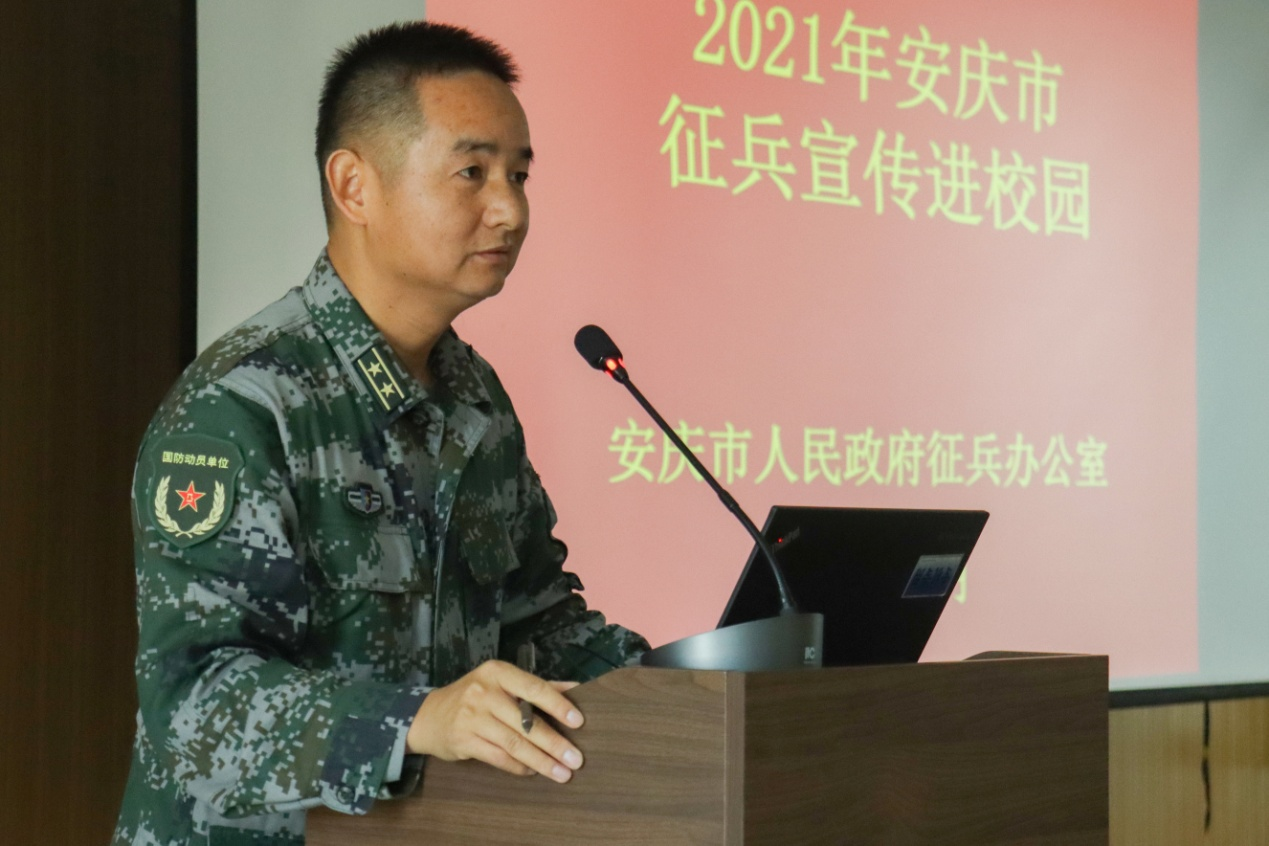 会上,高启长作为主讲嘉宾,首先向大家介绍了《中华人民共和国兵役法》的相关规定,接着详细讲解了大学生入伍的征集条件、征集流程,尤其是重点介绍了“安徽省大学生参军入伍优待政策”的相关规定。高启长在宣讲中强调,目前随着国家对兵员素质要求的逐年增高,大学生入伍人数日益增多。对于大学生毕业生来说,参军入伍不仅能提升自身能力,实现报国理想,更是一份全家受惠的政治荣誉。希望毕业生同学们积极响应祖国号召,踊跃报名参军。
