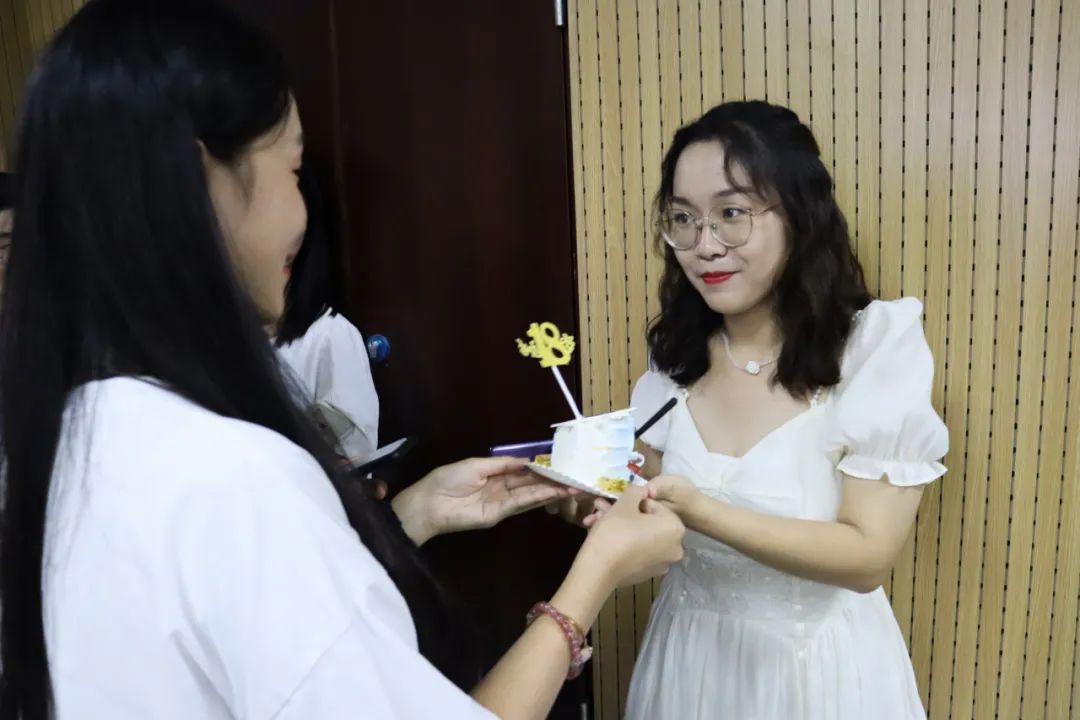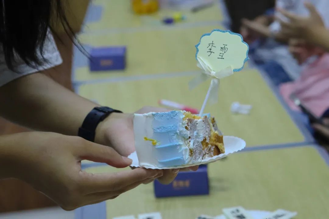 张梦楠、雷心雨、孙婉晴……7个16寸叠加12寸的双层蛋糕上,每一层都被整整齐齐地摆放上一块块写有新生名字的巧克力牌,王清所带的班级里,每一位学生都可以拥有一块属于自己的小蛋糕。“蛋糕好好吃啊!而且还有着我自己的名字,真的是太惊喜了!”国际经济与贸易专业2021(2)班的朱世秀拿到蛋糕时笑着表示这是她过的最特别的一个生日。