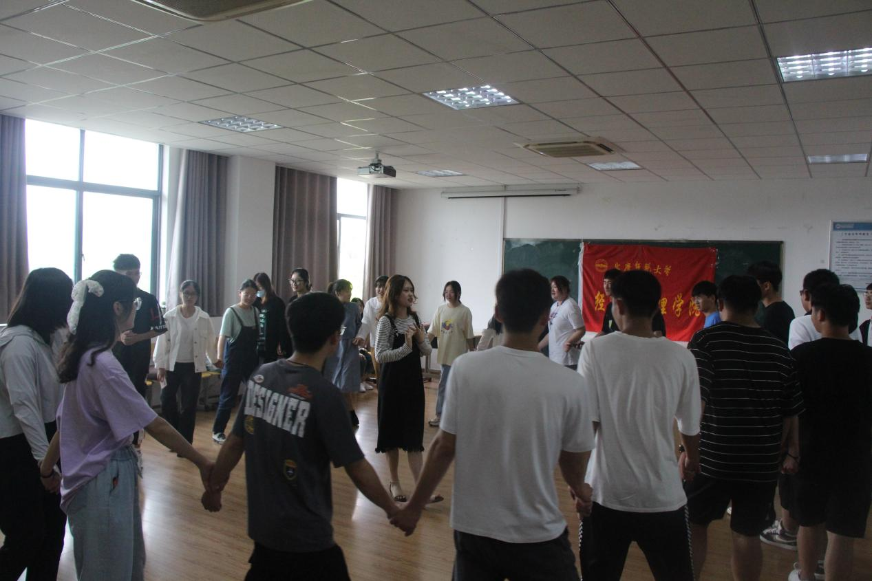 在李颖的组织下,同学们站成一个圈,依次报数分组,分组后按小组进行自我介绍,然后两次更换小组分别进行自我介绍。初步熟悉完毕后,依次进行了“大风吹”“桃花朵朵开”和“同舟共济”等小互动小游戏。