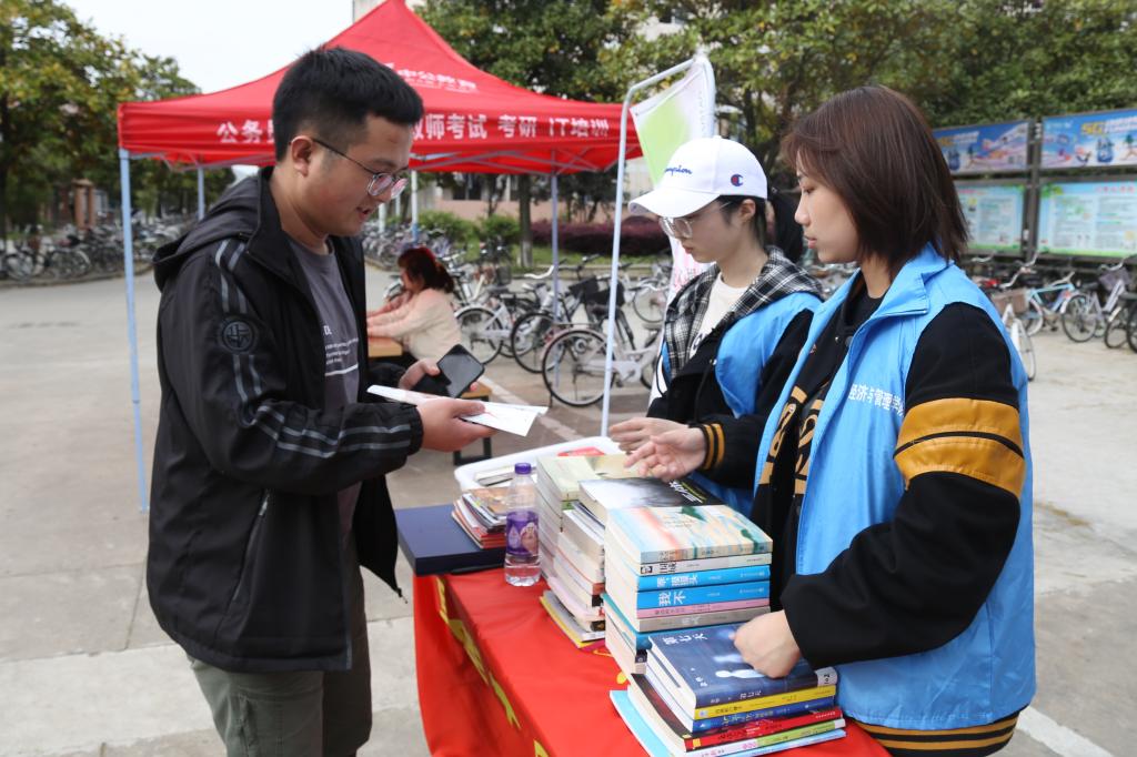 收集书册、登记信息、整理装箱……不一会儿,桌子上就堆满了各种课外书和杂志。设点处的忙碌吸引了路过的学生,他们纷纷停下询问情况,确认捐书种类的范围和活动截止时间。更有学生在自己募捐后,不断向身边的朋友介绍活动,鼓励他们也参与进来。