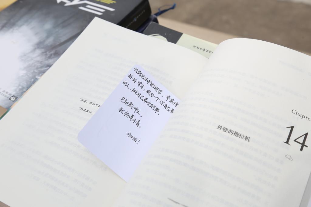 机械设计制造及其自动化专业2019(1)班的赵杰在整理募捐书籍时,偶然翻到《云边的小卖部》这本书里夹着这一张小纸片,他说:“我看到之后内心十分触动,这段话体现了我们开展这次活动的初衷,希望收到这本书的人可以永远对生活充满期待与热情。”