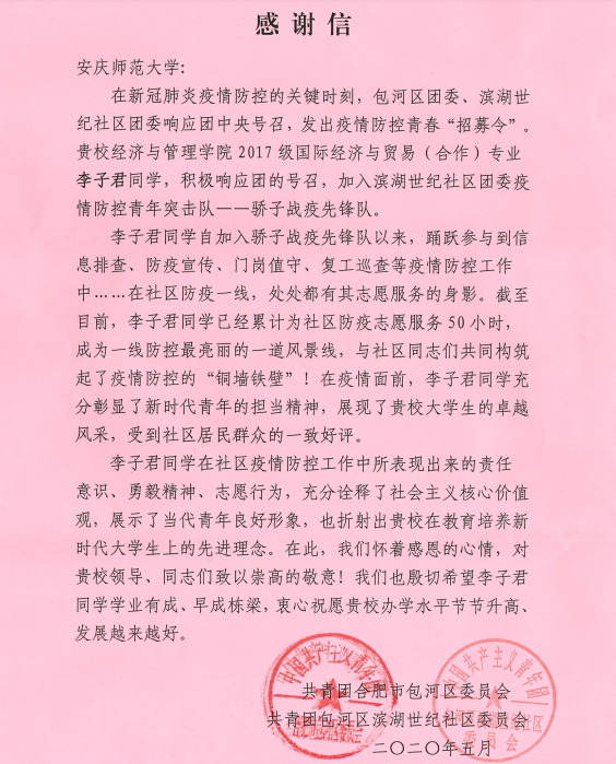收到一封来自合肥包河区滨湖世纪社区的感谢信。2017级国际经济与贸易(合作)班的李子君同学在新冠肺炎疫情防控的关键时刻,积极响应家乡团组织号召,参加家乡的疫情防控工作,主要工作内容为信息排查、防疫宣传、门岗值守、复工巡查等,累计为社区防疫志愿服务50小时。