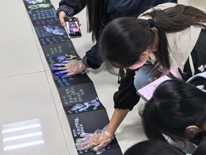 活动伊始,班级团支书围绕“传承国之文化,铭记初心使命”的宗旨,介绍了整体流程,为活动拉开序幕。“emoji猜猜乐”环节巧妙融合红色基因与时代元素,同学们积极思考、踊跃抢答,在生动有趣的emoji组合中重温革命历史,感悟家国情怀。随后的“你画我猜”环节气氛热烈,同学们轮流上台作画,尽管笔触各异、风格多样,台下观众热情参与、积极互动,现场充满欢声笑语。最后的“风琴本绘画”环节中,同学们静心创作,在折叠长卷上以画笔抒情、以手印铭志。一幅幅作品串联成歌颂时代、祝福祖国的动人画卷,充分展现了同学们的艺术才华与赤子之心。
