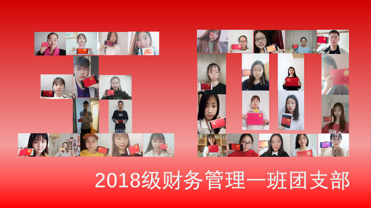 2018级财务管理一班团支部×××。我承诺,发挥团员作用,为团旗增色,为团旗增光。”铿锵而又坚定的话语展现了当代青年学生的青春风采。同时发挥创意将班级同学与团旗的合影拼接组合在一起,组成了“五四”字样的图案,寓意新时代的青年是一个团结的集体,将勇担时代大任,用青春谱写时代华章。