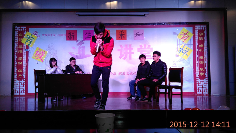 随后,“三人行”队为大家带来了诗朗诵《青春过往》。“神仙姐姐”队的话剧《恶搞版灰姑娘》,诙谐的反串表演,引的全场笑声不断。“逐愿”队带来了小品《朋友?朋友》。“heartbeat”队带来了话剧《15版梁祝》,演员们古装上阵,全新演绎了千古绝恋。“文艺萌宝儿”队带来了一段文艺歌舞。韩龙老师在现场演唱了一首自创歌曲《向前走》,他鼓励同学们在今后人生道路上学会坚持,勇往直前。