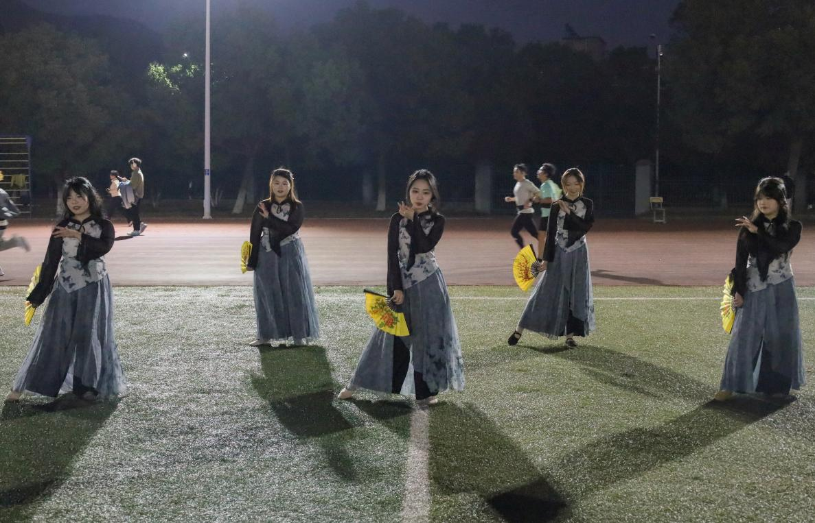 现场节目分为“奇幻童趣,热血集结”和“青春记忆,影视时光”两个篇章。身着新中式上衣与灰蓝纱罩阔腿裤裙,手持折扇半遮脸庞,由大学生舞蹈爱好者协会带来的群舞《戏文说》率先点燃了现场氛围。元气利落的动作搭配灵动轻快的音乐,群舞《attention》展现出满满青春活力;《神奇阿呦》主题曲独唱、《巴啦啦小魔仙》主题曲乐器演奏让人“梦回童年”;《夏至未至》、《旋风少女》等影视剧主题曲演唱则唤起了那份“青春回忆”。