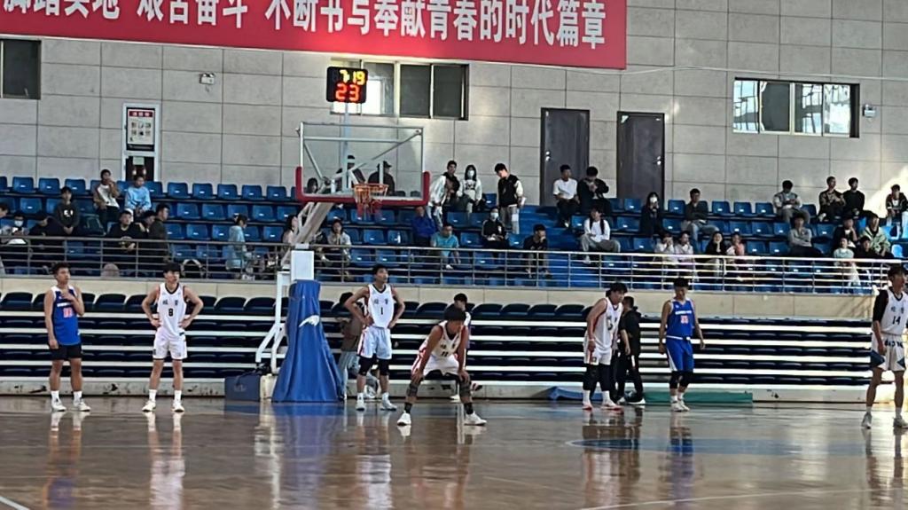 篮球队员打出较高水平。在上半场激烈的比赛中,我方队员不断向对方进攻,防守有佳,以35:28的比分获得上半场的胜利。下半场,对方球员不甘示弱,加紧了防守,篮球来来回回快速的穿梭于场地的各个方位,球员们也大汗淋漓,拍!传!投!挡!大家都屏住了呼吸……球进了!观众席掌声连连。