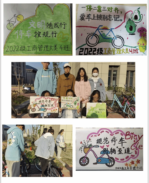 工商管理类专业2022(4)班的同学们积极主动地参与到规范停车的引导活动当中。志愿者们手持事先制作好的标语,引导大家规范停放自行车,并整理杂乱摆放车辆,对停车不规范行为进行现场劝导。
