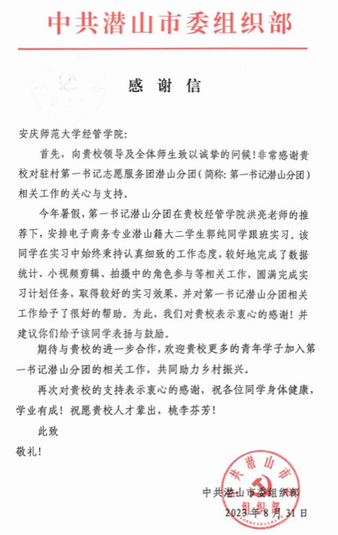 选派电子商务专业学生协助该市打造“第一书记潜山分团”IP抖音号表达谢意,并提议小说网