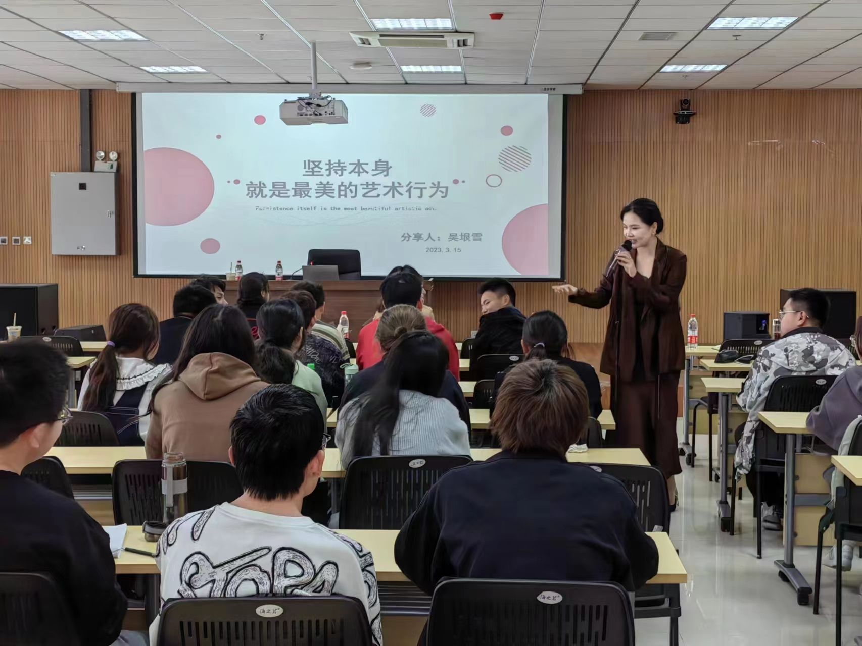 吴垠雪以“坚持本身就是最美的艺术行为”为主题向同学们分享了大学期间在文化学习、学生工作、竞赛挑战的经历以及工作后的创业历程。吴垠雪认为市场营销专业是综合软实力竞争,她以韩秀云等经济领域的著名教授为例,鼓励同学充分利用大学四年认真学习专业知识,丰富自己的专业技能,考取相关行业的资格证书,以便日后能够更好地立足社会。针对大学生创新创业,吴垠雪从“你执着地努力就占了大便宜”入手,指出创业历程的艰辛和坚持的意义。