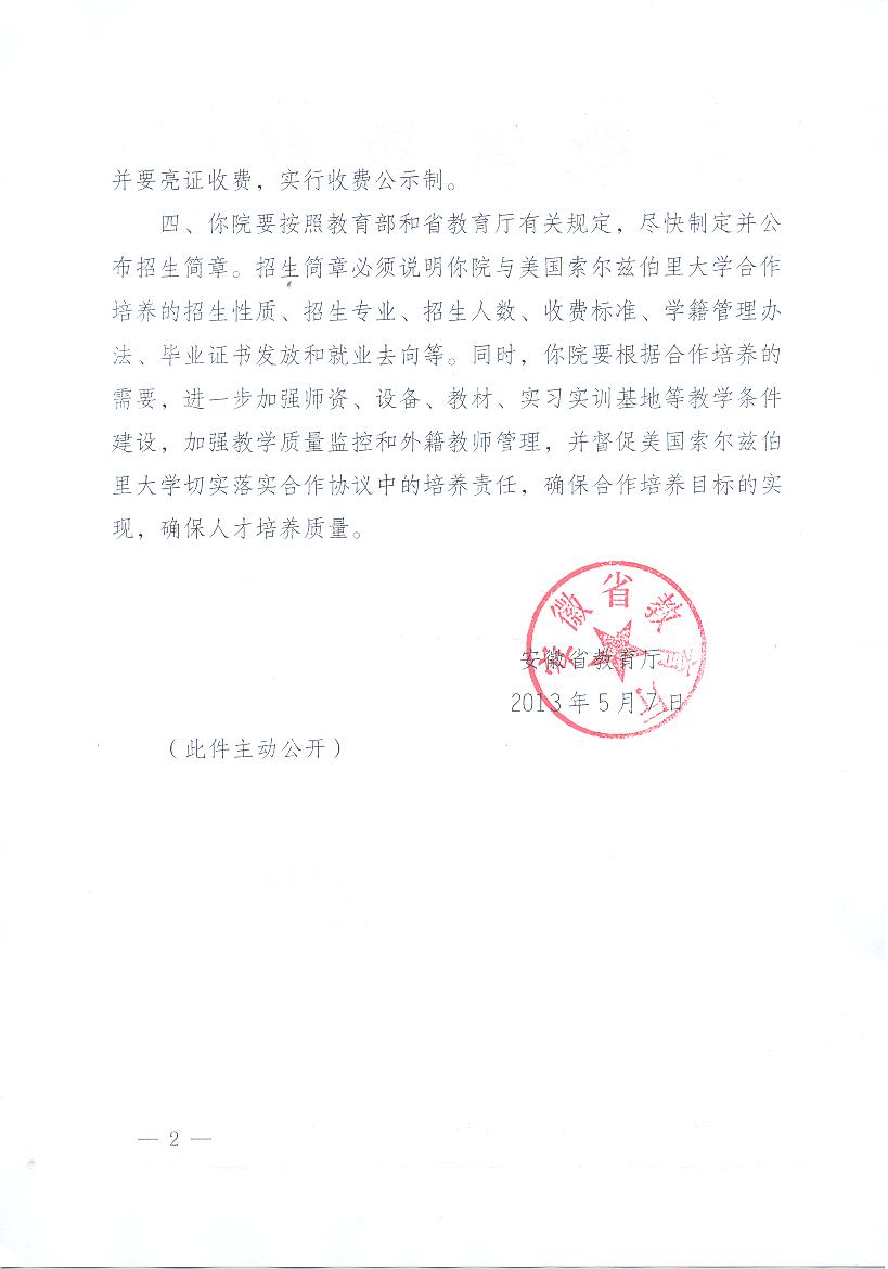 2013年5月7日,安徽省教育厅皖教秘高[2013]31号文批复,同意我校与美国索尔兹伯里大学进行中外合作办学,培养国际经济与贸易专业本科学生。今年我校将招收60名计划内本科层次的中外合作办学国际生。将按照国际先进的“2+2”教育教学模式进行培养,前两年在我校学习,成绩合格、符合相关条件者可以到美国索尔兹伯里大学学习后两年。学生在完成教学计划规定的课程和学分后,可以同时获得两校的学士学位。