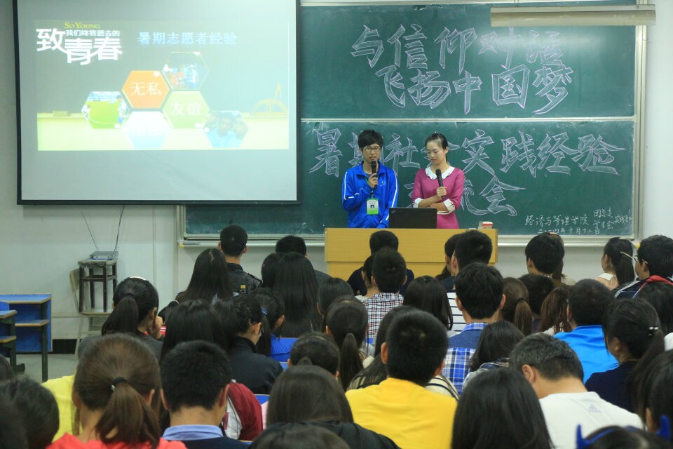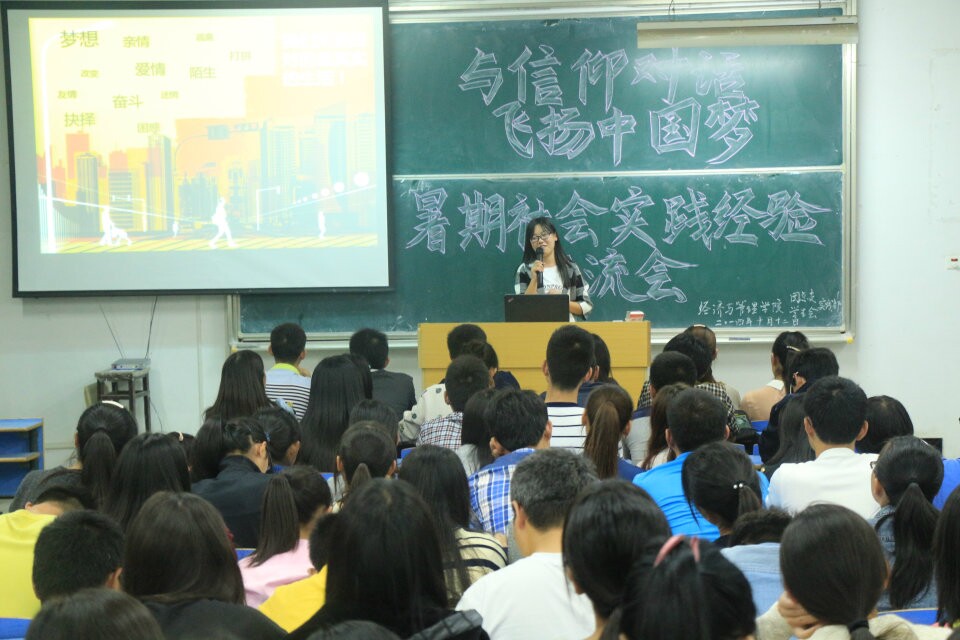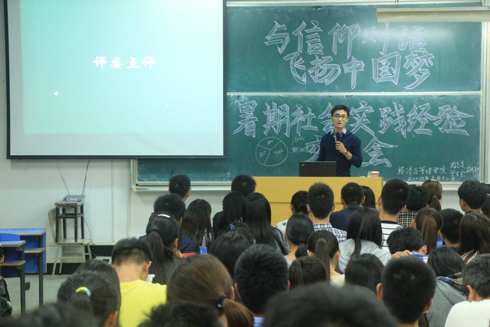 随后,7名社会实践代表依次通过PPT展示暑期实践活动,其讲述的社会实践经验涵盖寻访、调研、就业、创业、志愿活动。12级财务管理专业的刘安安同学,以走进小岗村实践调研的实践经历赢得关注。担任省运会志愿者的朱振文和叶露露认为“团队的沟通交流与合作的至关重要”。说起这段志愿者经历,他们微笑着说,“既然做就要做到最好,你只有真正付出才懂得其间真谛”。