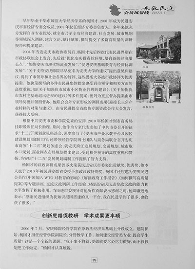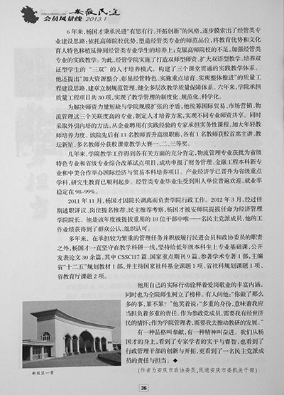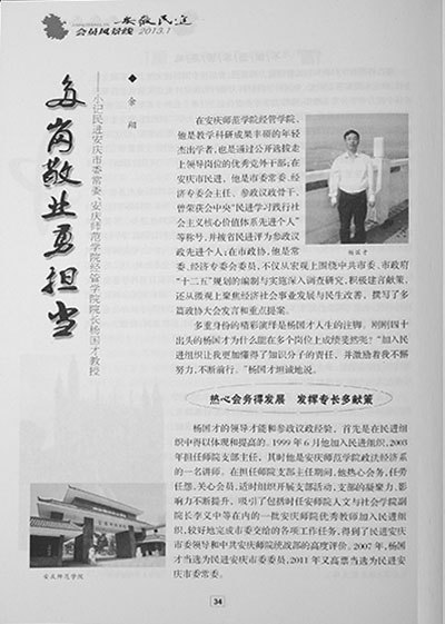 近日,《安徽民进》杂志以“多岗敬业勇担当”为题大篇幅专文介绍了民进安庆市委常委、安庆市政协常委、我校经济管理小说网 院长杨国才教授事迹。 文章从杨国才教授发挥专长、深入调研,为安庆市经济社会发展、城市规划建言献策,创新思路促进小说网 专业建设、教学科研以及自身学术成果等方面介绍了杨国才教授,充分肯定了杨国才教授作为行政管理干部的创新开拓精神和作为一名民主党派成员的责任与担当。