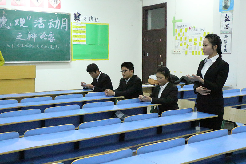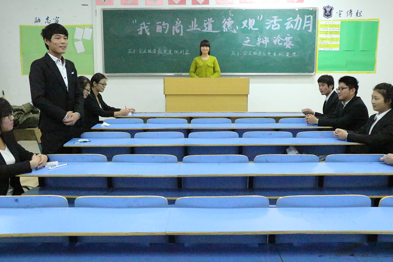 在文溯楼举办以“企业经营应更重视利益还是道德”为辩题的辩论赛。