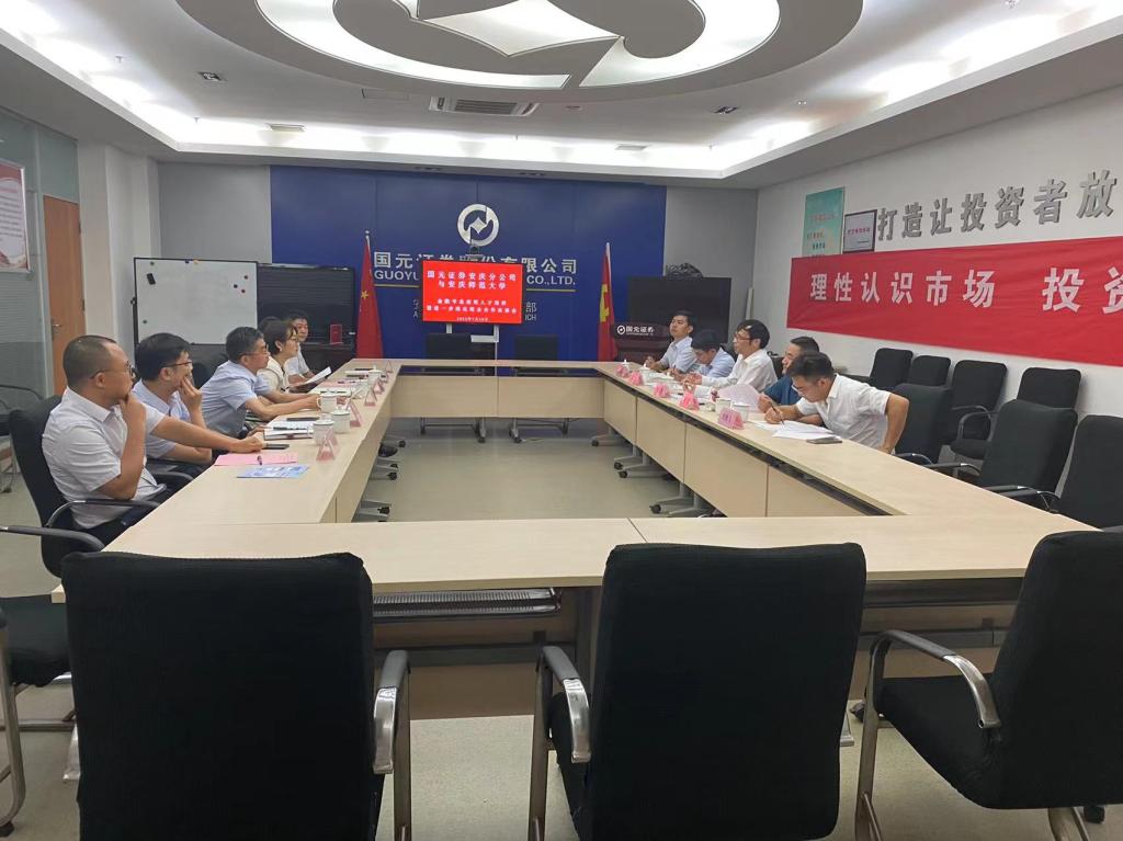 在国元证券暑假实习学生,听取了国元证券公司领导对学生实习情况的介绍,了解学生在国元实习现状,并要求学生认真学习证券相关实际操作知识流程,努力提升专业技术和实践能力。