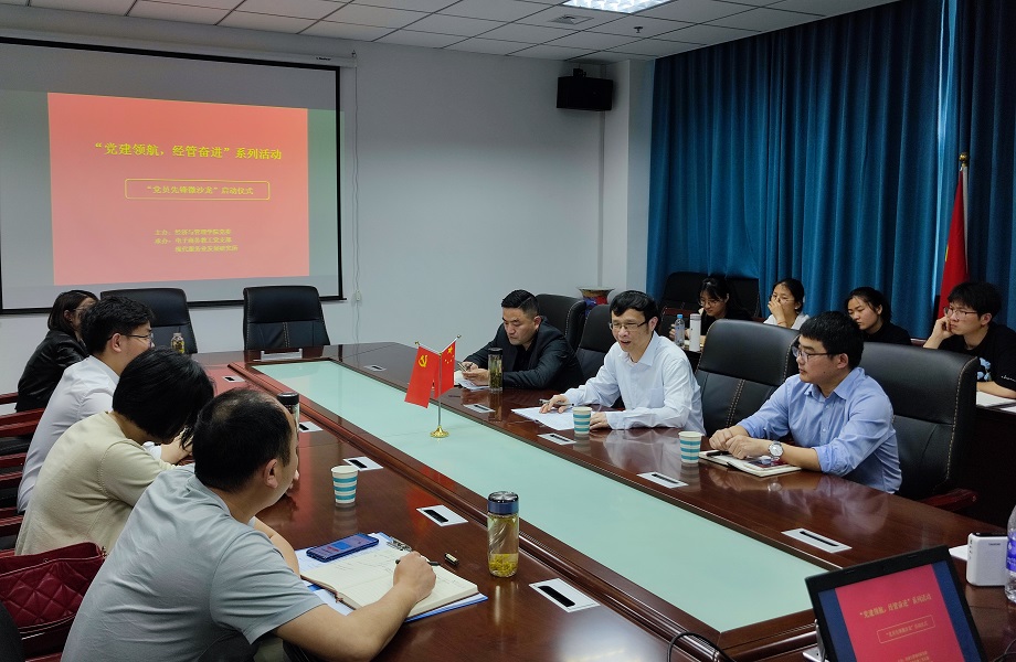 党委制定的实施方案,“党建领航,经管奋进”系列活动包含党员先锋微沙龙、专业学习实践营、先进典型人物簿、结对帮扶志愿队共四类形式。首场党员先锋微沙龙聚焦“大数据”这个主题,嵌入了两个紧密联系的活动环节。在活动的第一个环节,电子商务教工党支部举行了主题党日活动,徐俊杰教授做了题为《工信部 <“十四五”大数据产业发展规划>政策解读与思考》的分享汇报,重点介绍了规划编制背景、发展目标和主要任务,并从修订人才培养方案、申报新专业、凝炼科研方向、搭建科研平台、开展社会服务五个方面出发,探讨了如何将这份规划融入学科和专业建设工作中。