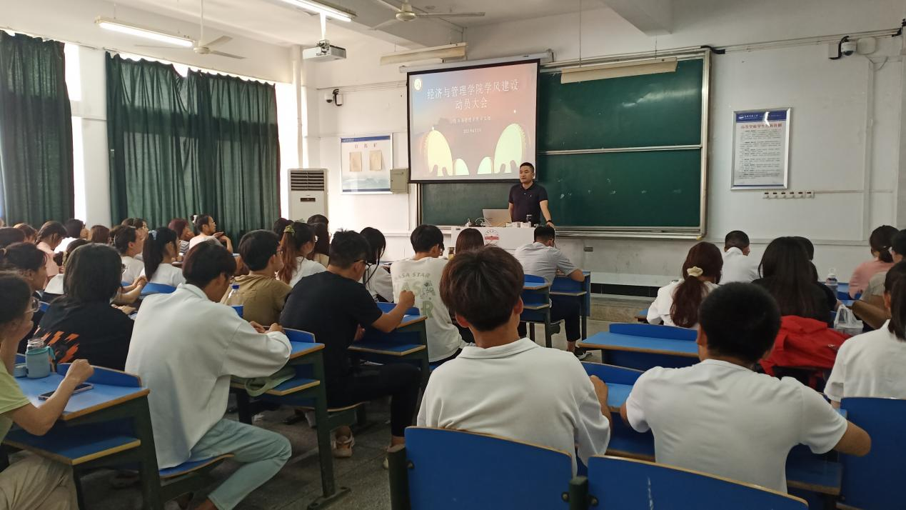 目前的学风状况进行了分析,指出要统一思想,提高认识,明确学风建设的重要意义;其次要强化管理,明确学风纪律要求,同时加大学风巡查力度,构建学风建设长效机制;最后希望全体参会同学要在学风建设中做好表率,带动全院同学积极行动,为学风建设贡献自己的力量。