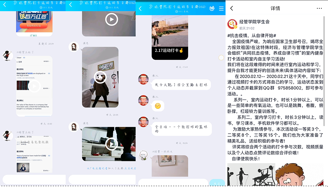 举办的“共同抗击疫情,养成自律习惯”的室内健身打卡活动和室内自主学习活动。