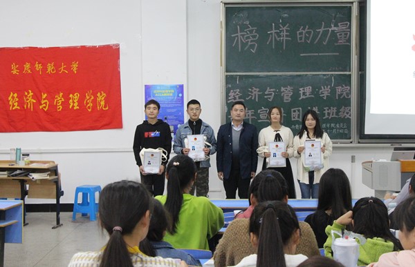 “我们最怕碌碌无为,还安慰自己平凡可贵”,来自2016级物流管理的李忠钢同学结合自身的发展经历,与大家分享了有关学风创优方面的经验。他建议学弟学妹在大学四年里要掌握正确的学习方法和技巧,寻求适合自己的学习方式;积极参加各类比赛,扩展多领域知识面;拓宽人际交往圈,培养自己的兴趣爱好。在社会实践学习方面,2017级金融工程的黄帅同学向我们讲述了他参加社团的经历以及在学校青年志愿者活动、“三下乡”活动、暑期夏令营等各种活动中的收获,并建议同学要“复杂的事情简单做,简单的事情认真做,认真的事情重复做,重复的事情创新做,如此便事半功倍”。来自2017级市场营销陈兴枝同学围绕“如何建设好自己的班级”同大家分享了她作为团支书与班级团体的共同努力的经历,以及有关“三会两制一课”、青年大学习、团日活动等其它班团建设事宜,强调了个人荣誉与班级体荣誉的密切关系,鼓励大家团结起来,为建设更好的集体而共同奋斗。2018级电子商务王兰就学科竞赛方面向大家介绍了比赛前应当认真做好准备工作,了解比赛、确定主题、搜集资料、作品撰写等,她还幽默的向我们展示了她们团队间的励志故事,激励我们珍惜锻炼的机会,坚定自己的决心。