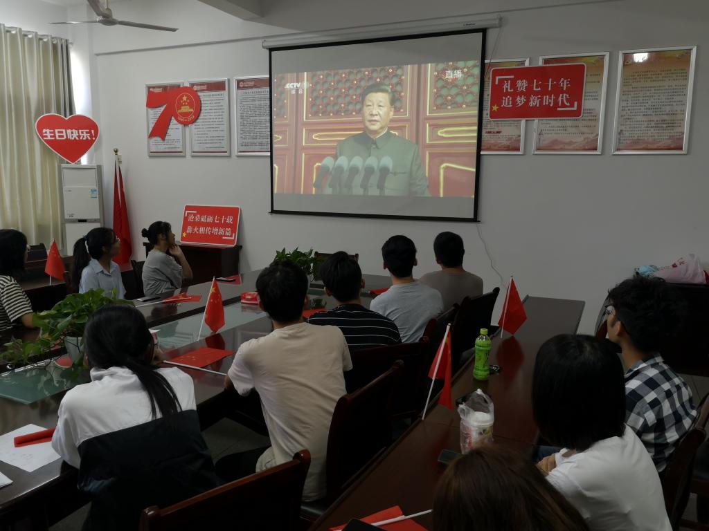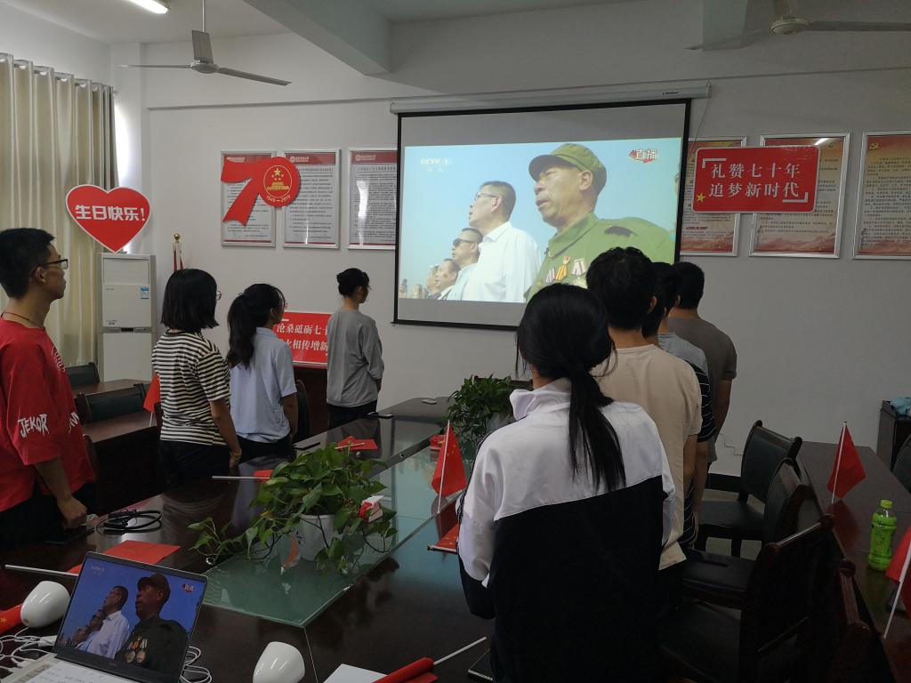 团委副书记贺卫老师作简短发言,带领大家回顾了新中国成立后历次阅兵的基本情况,分享了观影体会。上午十点整,随着阅兵仪式的正式开始,大家目不转睛的盯着屏幕,不愿意错过每个精彩的画面。看到阅兵式上海陆空三军仪仗队飒爽英姿时,大家纷纷惊叹,骄傲、自豪之情油然而生!同时同学们也被中国强大的国防力量深深震撼,脸上不时流露出对阅兵式展现出强大国威和军威的无限自豪!群众游行环节中,一辆辆体现时代色彩的主题彩车通过天安门广场,生动再现了中国共产党团结带领中国人民为实现国家富强、民族复兴和人民幸福的事业所进行的不懈探索和努力奋斗。同学们深深感受到,新中国的建设史也是全体国人的奋斗史,祖国的明天必将会续写新的辉煌!