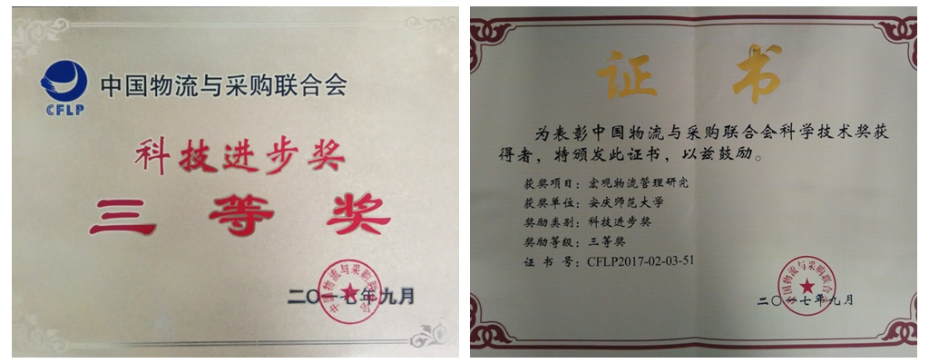 李亦亮教授出版的著作《宏观物流管理研究》荣获科技进步三等奖。项目团队于9月25-27日赴南京参加了第十届现代物流科技创新大会并领取了获奖匾牌、证书。