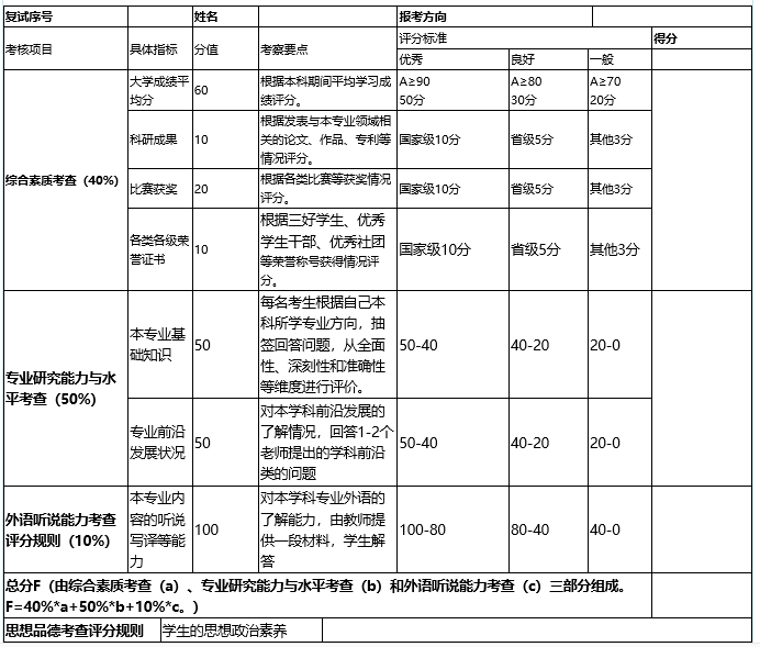(1)考查方式:考生先简介自己的学习经历或工作经历,然后展示已按要求提前提供的大学学习成绩单、毕业论文、科研成果、获奖及荣誉及其他能佐证其综合素质的材料,考官根据考生提供的书面材料,结合考生的简介,现场按百分制打分。