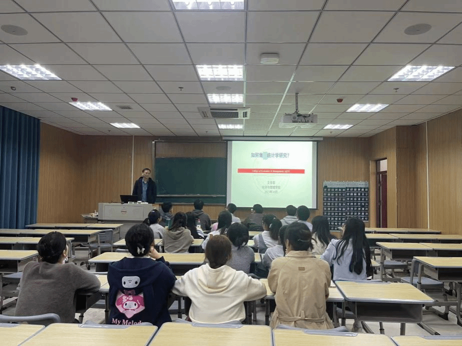 王全忠副教授以“如何做统计学研究”为题,着重分享了怎样确立科研选题、统计学研究三要素以及文献阅读方法。殷功利副教授介绍了研究生课程学习、创新创业教育等核心培养过程相关要求,并就国际商务专业实践做了指导。