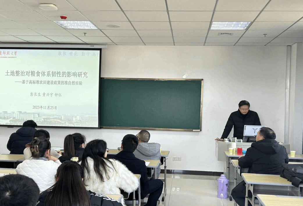 彭长生教授作为导师代表,现场分享了题为《土地整治对粮食体系韧性的影响研究——基于高标准农田建设政策的准自然实验》的主旨报告。彭长生教授以这项成果为范例,概括介绍了实证论文的布局特点,提醒与会学生要尽力关注学术前沿话题,广泛阅读权威文献,审慎确定有价值的被解释变量,学习借鉴高质量论文的分析框架,按照先易后难的原则逐步推进研究。周汪洋作为校外实践导师代表,分享了题为《地方邮政在国际贸易中的角色跃迁与机遇》的主旨报告。他在报告中系统梳理了地方邮政从传统通邮服务向跨境贸易综合服务商转型的实践路径,深入分析了地方邮政在跨境电商物流、海外仓布局、通关便利化等领域形成的新竞争优势,提出地方邮政应通过“邮政+电商”“邮政+金融”等模式创新,构建端到端的国际商贸服务生态。