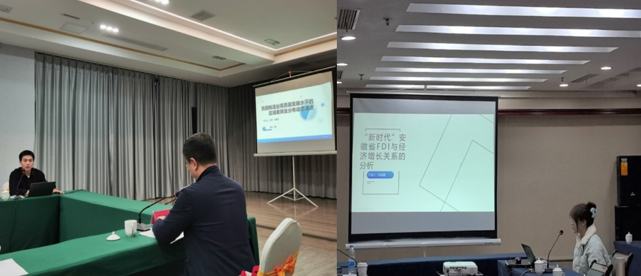 在下午的主题报告环节,23级国际商务硕士研究生王澎作了“我国制造业高质量发展水平的区域差异及分布动态演进”主题分享,24级国际商务硕士研究生许银霞作了“新时代安徽省FDI与经济增长关系”主题分享。
