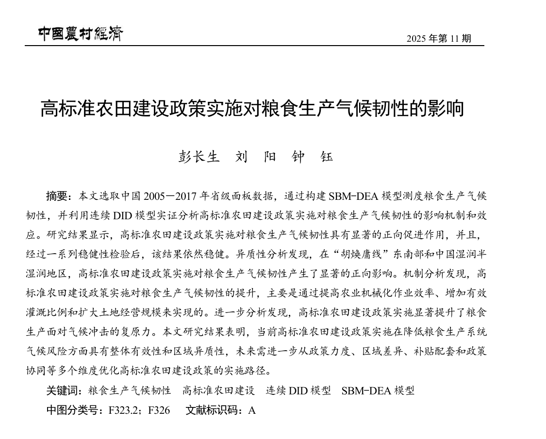 2023级统计学研究生刘阳与导师彭长生教授在国内农村经济研究领域顶尖期刊《中国农村经济》2025年第11期发表学术论文《高标准农田建设政策实施对粮食生产气候韧性的影响》。《中国农村经济》系国家社会科学基金首批重点资助期刊、国家自然科学基金委员会管理科学部认定的管理科学重要学术期刊、中文社会科学引文索引(CSSCI)来源期刊。期刊综合影响因子为14.085,在农业经济类学术期刊中排名第一,在13个经济学学科的514种学术期刊中排名第三。