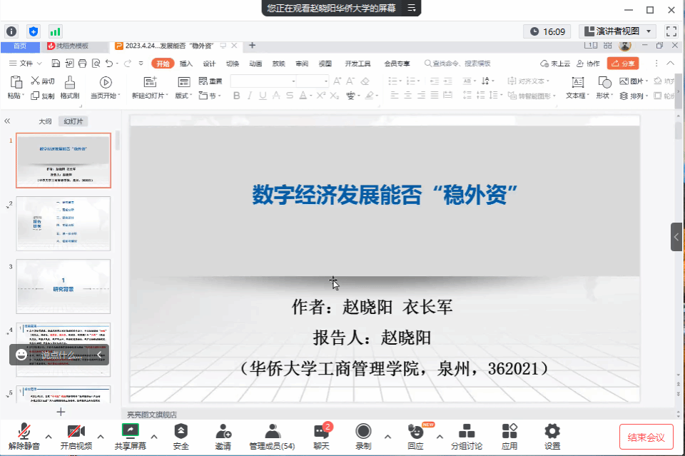 、区域经济与城乡发展研究所联合主办的研究生学术交流平台“优博讲坛”第8期开讲,来自华侨大学的赵晓阳博士在线分享了题为《数字经济发展能否“稳外资”》的学术报告,全体统计学研究生、本科生及部分老师参加了交流活动,讲坛由彭长生教授主持。