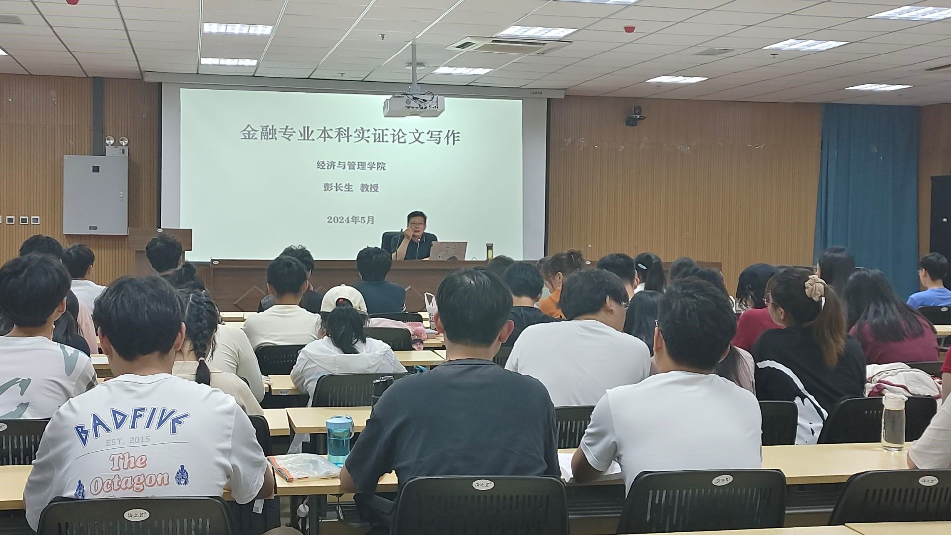 2024年5月23日晚上的经管楼112教室里气氛热烈,彭长生教授与120余名金融工程以及2023级金融工程陶因班的同学共聚一堂,共同探讨“金融专业本科实证论文写作”。