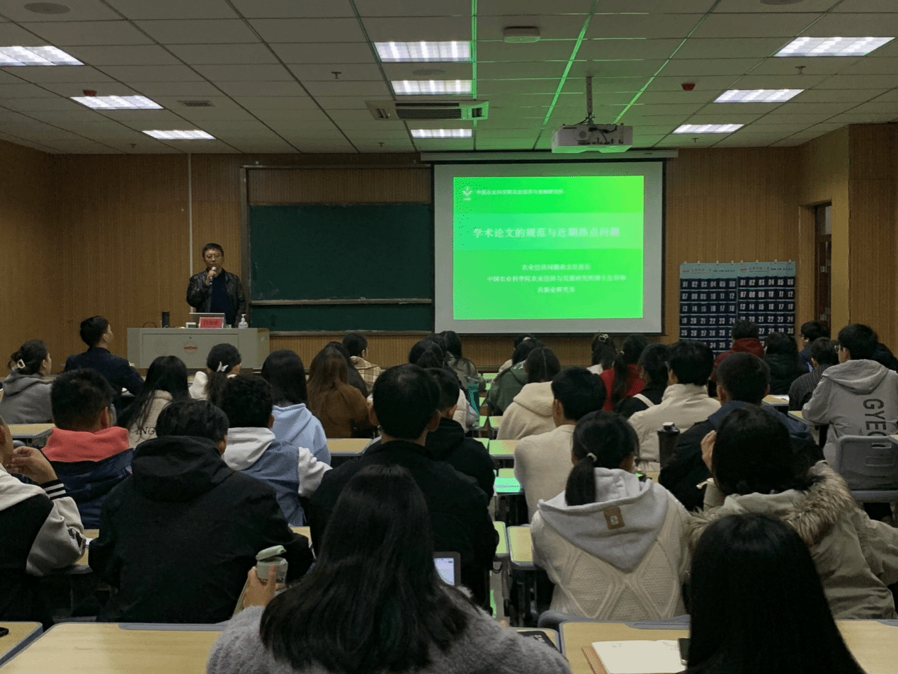 吕新业担任《农业经济问题》杂志社社长,兼任中国农业经济学会常务副秘书长、中国农业技术经济学会常务副秘书长,拥有丰富的论文写作和审稿经验。此次报告共包含了学术研究特征、规范的论文结构、存在的普遍性问题、论文体例、近期重要选题五个方面。吕新业社长结合自身工作经历,从导论、综述、模型、结论建议等方面细致讲解了如何撰写一篇优秀论文的规范结构。他认为,优秀论文的选题一定要聚焦国家发展战略的实际需求与学术领域发展新方向,研究人员应当多去基层走访调查,以问题为导向,提炼科学问题。他指出,论文写作要有明确目标,研究过程要有科学计划,行文内容需围绕假设依次展开,模型构建要以理论方法为基础,最好能有原始数据做支撑。吕新业社长结合多年审稿体会,概括了论文写作过程中常见的七个问题,提醒现场师生要留意规避。吕新业社长最后介绍了《农业经济问题》投稿的流程与具体要求,并分享了若干重点选题。